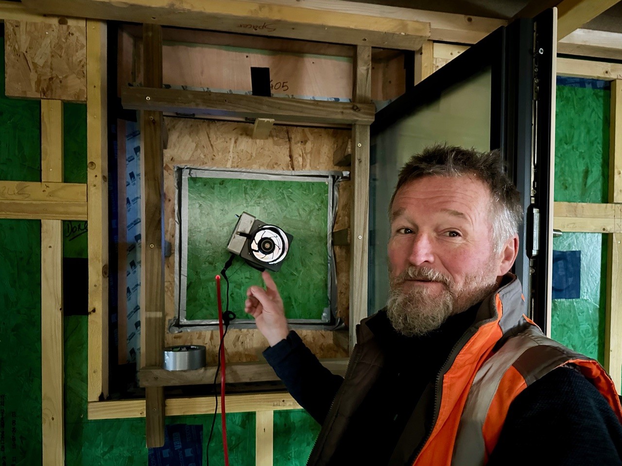 'Just for fun, testing a 260m2 Passivhaus with a 12V fan with builder Dai Rees. Official test result 0.1 ach @ 50Pa.’ Photo credit: Elemental Solutions.