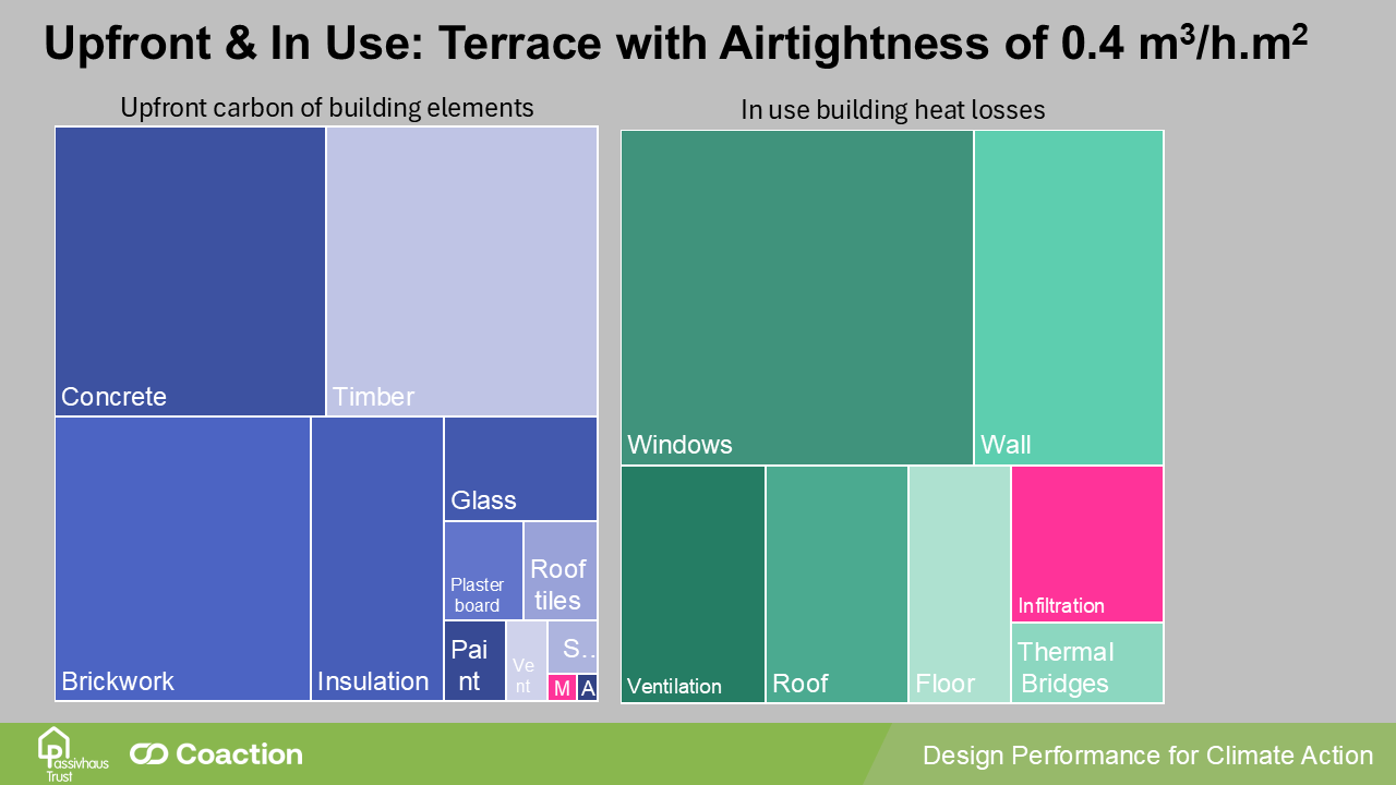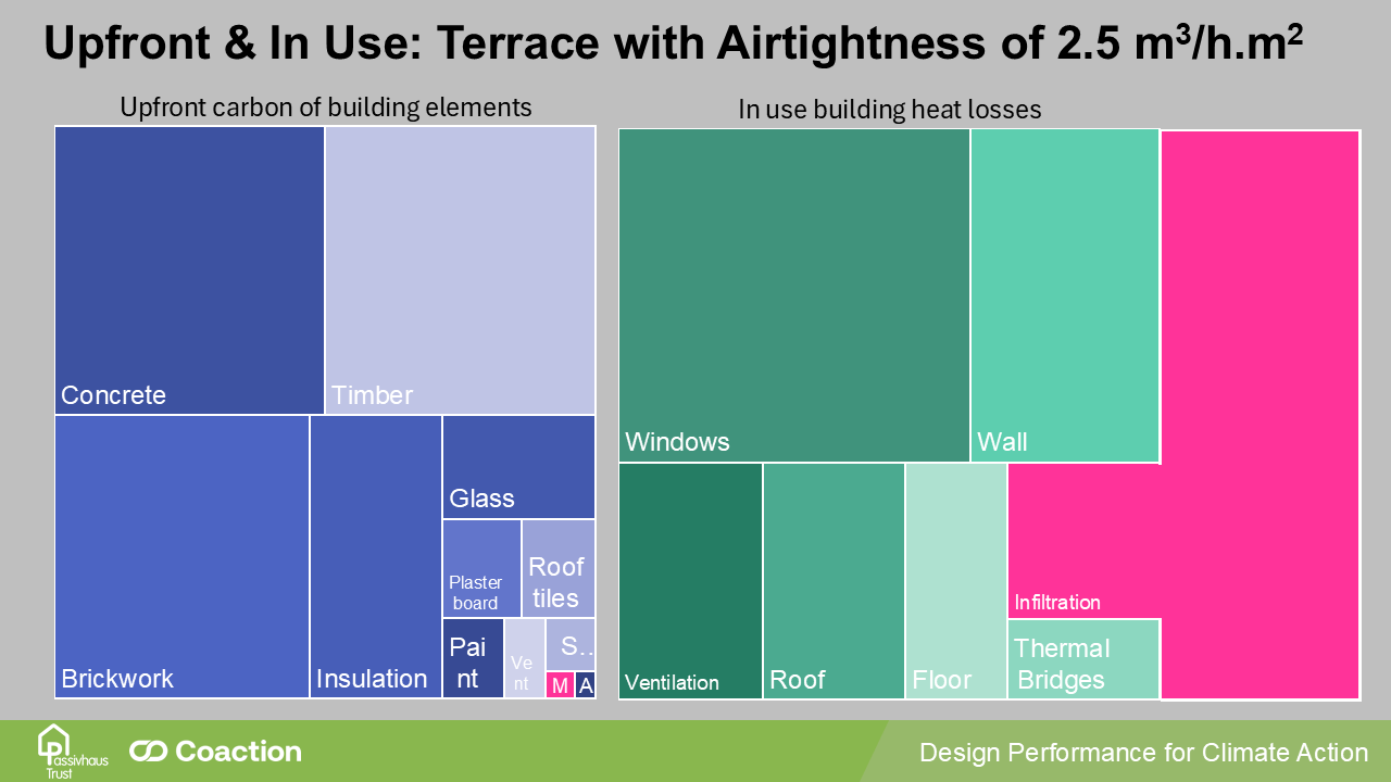 Highlighted in pink - Left: M=membrane carbon emissions. Right: Infiltration = heat loss due to air leakage at 2.5 ach compared to heat loss at 0.4 ach for the same upfront carbon! Image credit: Sally Godber
